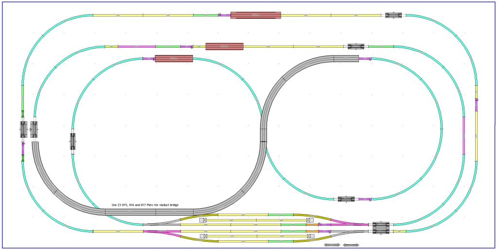 In this version, I changed the elevated viaduct in the back in favor of an elevated viaduct S-curve that traverses front and center (sort of) across the layout. True, I would need to purchase additional viaduct and I was glad to do so. This element has become a hallmark of my layout and it’s a significant moment for me when I created it. I had one red truss bridge from my V2 and I added 2 more red girder bridges to the layout, creating a unique look, as well as a challenge in finding a creative way to connect these bridges with water under them when it came time to develop scenery around the layout.