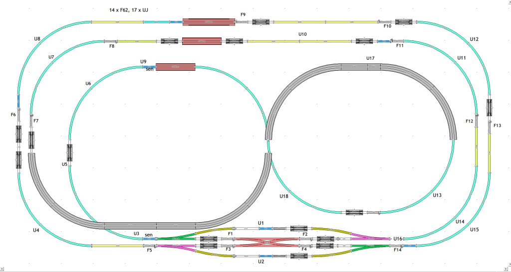 Another point to notice in the above plan is the location of the 32 feeders. “F62” is how I refer to the Kato S62F 62mm feeder, and “UJ” are UniJoiners. This document was VERY important to me in building this track, because it helped me keep track of where the Feeder wires were during the process. Once I started plastering, this document became CRITICAL. I found at least 2 feeders that I would have covered with plaster, had I not had this document!